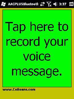 This program allows you to compose a voice recording in the compact AAC plus audio format and share via Bluetooth. Tap the button to start the voice recorder and tap again to stop the recording and convert to AAC-Plus compact file format. The program will then send the audio file via Bluetooth. The AAC-Plus codec is from 'The 3GPP instrumenting tool' (c)2010 Tipok