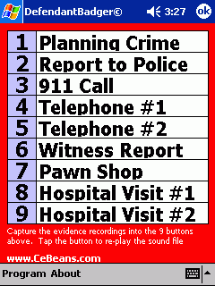 This program can be used during a court cross examination. Record the sound clips of evidence. When the defendant denies an action tap the button to replay the file.
