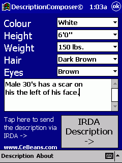 This program allows you to compose a description of a suspect and export it into a Pocket word or IRDA it to another PocketPC.