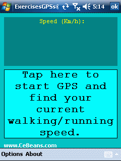This program uses the GPS on your PocketPC to measure your speed/walking/running speed. The program displays your speed in Km/h with 3-digit accuracy. NOTE: Use caution when exercising and using this program.