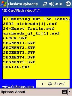 This program allows you to browse the folders of your PocketPC for .SWF flash animations. When you tap on a SWF file the program starts the player. The player is customizable (Options).