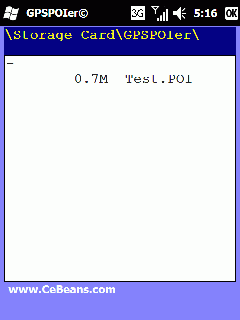 This program can be used to create GPS tagged POI points with custom names. You can use the GPS on your PocketPC to create a named POI with text note. The program displays the distance of each POI from your current GPS in real time.