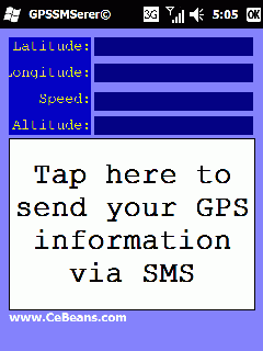This program uses the GPS on your PocketPC to find your latitude/longitude/altitude and speed and creates a single blank SMS template. When the program gets its first lock then it creates an SMS with your GPS update location and a link to the Google.com mobile online street map.