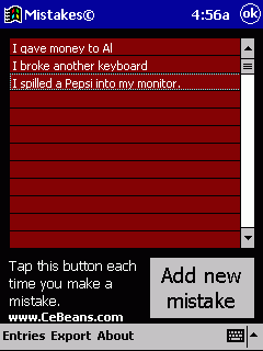 This program allows you to track the mistakes that you make in a day. The goal each day is to make less mistakes. You can export the list into Pocket Word.