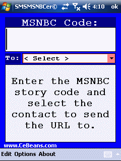 This program allows you to send a MSNBC story to a contact via SMS. You can create a list of contacts to share URLs with. When you want to share a story enter the story code number and select the contact. The program will create the full mobile URL and a blank SMS with the URL. This service is provided by www.MSNBC.com