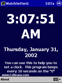 This program can be used when setting time for a clock. The PocketPC beeps every "0" second and you can use the beep to set the time.