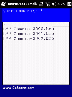 This program allows you to create a rotated image of a bitmap with a built in editor and share the rotated image via Pocket OutLook. Use the file based explorer to locate the bitmap file and when you tap on it you can view it in the viewer. Use the slider to adjust the angle of the picture. When done select 'Send Email' from the toolbar to share the rotated image via Pocket OutLook. The rotate effect filter is from the open source C++ BitmapEX project.