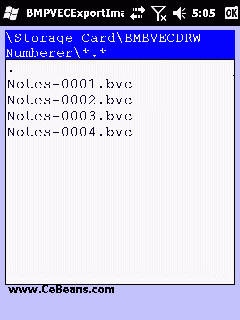 This utility converts a BMV (Bitmap vector file) into a BMP, GIF, PNG, TIFF or JPEG image for the CeBeans BMPVEC apps. Use the built in file explorer to locate a folder of BMV files and tap on a file to convert to the selected image format. The program allows you to preview the image before converting and also view the image file in your picture viewer when done.