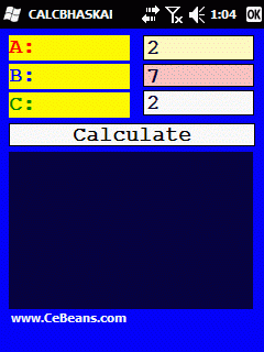 The Bhaskara formula can be used to solve quadratic equations by calculating the discriminant and using the formula x = (-b ± v?) / 2a to find the values of x. Enter the values for A, B and C and tap the button to do the calculation. The program then allows you to copy the report to the PocketPC Clipboard.
