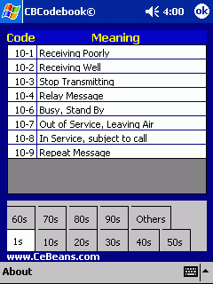 This program is a quick reference to the CB radio codes. Tap the number to get a list of the codes for the number range.