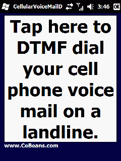 This program is a quick DTMF shortcut to your cell phones voice mail when your using a land line. Simply place the speaker of the PocketPC to the land line phone and tap the button and the program will query the GSM network for your cell phone number and DTMF Dial it. You can use this to get your cell phone voice mail on a land line.