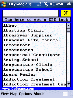This program uses the GPS on your PocketPC to find the 50 closest local business from 2,238 type of Yellow Pages entry sorted via GPS distance and stores the results into files based on store type. Tap the button to start the GPS and when you get a lock tap on it to view the list of local businesses. The GPS maps and business search service is provided by www.Google.com