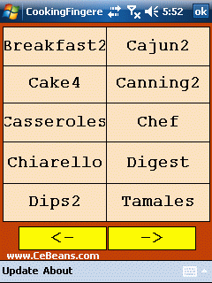 This program searches the storage RAM and storage card(s) for CeBeans.com Cooking eVB programs and creates a finger friendly launcher database. Select 'Update Database' to create the database and tap on the CookBook name to open it.