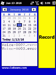 This program is a compact EVRC audio voice recorder (Enhanced Variable Rate Codec) that works via calendar interface. Tap the 'Record' button to start the recorder and tap the button to stop the recorder. When you stop the recording the program instantly converts the audio to the heavily compressed EVRC audio file format. The program also allows you to play the compact audio files. The audio codec is from 'Enhanced Variable Rate Codec - Bit-Exact C Specification ' Copyright (C) 1997-1998 Telecommunications Industry Association.