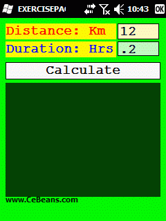 This program calculates your exercise jogging/walking or running speed based on distance and total time. Enter the distance (In Km) and the total time (In Hrs.) and tap the button to create the report. The program will create a full report of the exercise session and help you to understand speeds. You can then export the report to a bluetooth report.