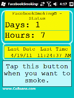 This program allows you to update your Facebook 'My Notes' each time you smoke. When you smoke tap the button to update your 'My Notes' folder with a new entry with the last date/time of the last smoke. Your doctor/nurse can use the PocketPC FacebookSmokings(c) to track your smoking habit. This service is provided by www.FaceBook.com