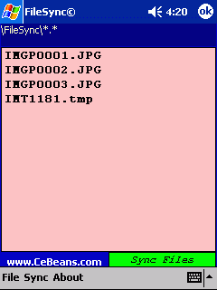 This program allows you to select files on your PocketPC. Tap on the file to place it into the '\FileSync' folder. You can also make sure the files are the same when you are in the '\FileSync' folder.