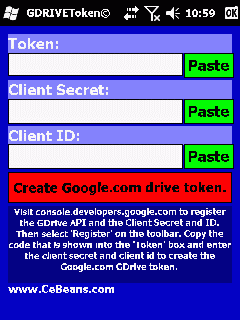 This program creates the 'GDRIVEToken.dat' file that is needed to use the CeBeans GDRIVE apps. Visit the Google.com developers website and register a new app and enter the client secret and client id in the boxes. Select 'Register app' from the toolbar to get the token and copy the token into the box and tap the button to create the token data file. All the CeBeans Gdrive apps use this app folder for the token. NOTE: This program only has to be run once. This service is provided by www.Google.com