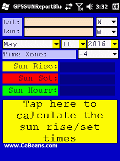 This program is a calculator that calculates sun rise/set times based on the date and GPS coordinates you enter and sends the report via Bluetooth. Enter the GPS latitude and longitude and the select date and time zone. When you tap the button the program will calculate the sun rise and set times as well as the total amount of sun time for the locations.