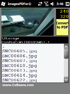 This is a JPEG picture previewer that allows you to export the image into a PDF file. The program uses the Windows CE Internal API to view the images. Simply select the folder where the images are located and tap on a image to preview. Tap the 'Create PDF' button to compose a PDF. The PDF libraries are from JPEG2PDF by Hao Hu (c)2008