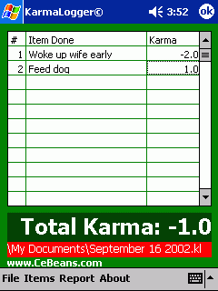 This program allows you to enter when you do a good/bad thing and you can rate the 'karma' for each item. The entries are stored in a compact file format.