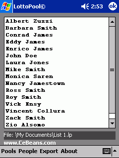 This program can be used to track the people in a lotto pool. Enter the names and any notes for each person. You can also export the file into Pocket Word format.