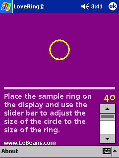 This program can be used to find/compare a ring size. Move the slider bar to adjust the circle to the size of the sample ring.