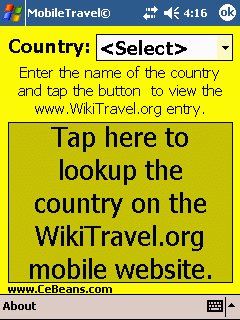 This program allows you to enter a country name and then searches Wikitravel.org website for that country. NOTE: You must be connected to the internet to use this program.