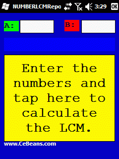 This program allows you to enter two numbers an when you tap the button calculates the LCM (Lowest Common Multipler) and displays it and allows you to export to a text file. Simply enter the numbers to find the LCM of the numbers.