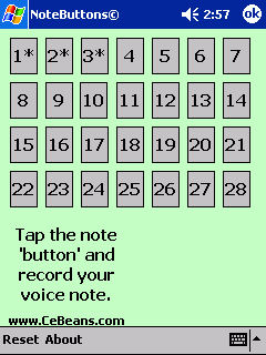 This program allows you to make 28 voice 'notes' the notes are stored in 'wav' file format in the '\NoteButtons' folder of your PocketPC.