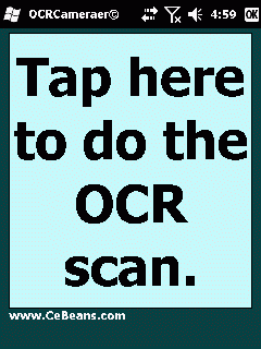 This program converts your PocketPC camera into a OCR (Optical Character Recognition) scanner. Simply place the camera on the document to convert and tap the button to take a picture of the text. The program will convert the text of the document into text and display in the built in viewer. The OCR engine is from GOCR 'Optical-Character-Recognition program' (C) 2000-2006 Joerg Schulenburg