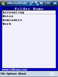 This program allows you to make category folders and places Pocket Excel, Word, Notes and Text files into subfolders based on the main folder name. When you create a new Excel, Word etc. the number is added. The program also compresses and decompresses the file when you save/view the file. The GZ ZIP compression/decompression is from www.Gzip.org