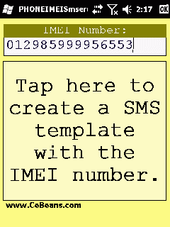 This checks your phones GSM modem and reports the IMEI number and creates a blank SMS template with the number. Simply start the program and tap the button and the program will create a SMS template with the IMEI number. NOTE: The phone power must be on to use this program.