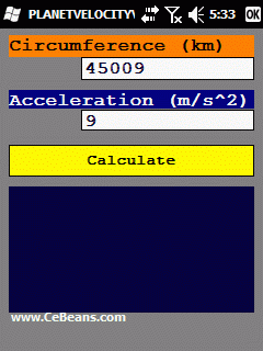 This program calculates a planets velocity and displays a report. Enter the Circumference (km) of planet and the Acceleration due to gravity (m/s^2) on planet. The program will then do calculation to find out the Acceleration due to gravity (m/s^2) on planet. The calculation is written in C++