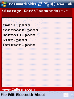 This program allows you to create and update passwords in a folder interface. For each service you can create a new .pass file with the username+password of the service. You can manage the .pass files with the built in file explorer. The program also has bluetooth send and receive services.