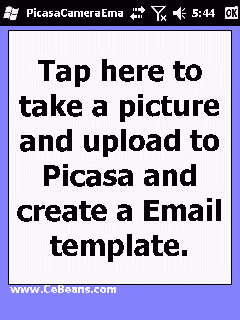 This program is a camera app that uploads the pictures taken to Google.com Picasa in real time and creates an email template with the public URL of the picture. Simply tap the button to start the PocketPC camera and when you take a picture the program will upload it to your Picasa dropbox with the file information as the picture text. The picture upload service is provided by www.Google.com