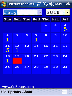 This program indexes a day, today or ALL of the pictures that were taken on a date and places the index in a subfolder under the cameras folder. When you tap on a day with no entries the program will allow you to index the pictures for that day. Tap on the picture/video file to view.
