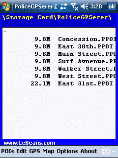 This program can be used by a Police officer to create dated GPS POI based note/picture/video logs. For each GPS area you can create a log of reports and attach pictures/videos of the area. The program uses the GPS on the PocketPC to find the distance of each GPS POI point and you can view or download the map the points on Google.com map service.