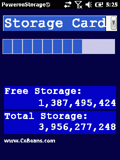 This program is a storage card(s) monitor that pops up each time you power on your device. Simply select 'Register App' in the toolbar and each time your device is powered on the program will start with the storage card information. NOTE: To remove the program from startup use the toolbar option.