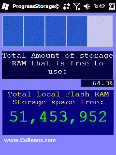 This program graphically displays the storage FlashRAM of your device and reports as a percentage in real time. Enter your total start storage and the program will monitor your storage memory and display the percentage of total ram left on your device.