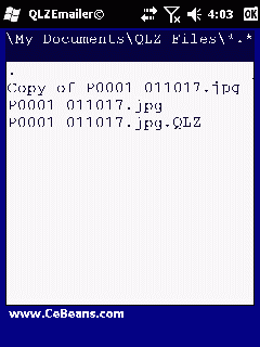 This program compresses a file with the QLZ compression codec and creates a blank email with the file attached (to save on data charges). Use the built in file explorer to locate a file and when you tap on the file the program compresses the file with QLZ compression and creates an email template with the file attached. The other user can use the PocketPC QLZFiler(c) app to decompress the file. The QLZ compression is from 'Fast data compression library - Copyright (C) 2006-2011 Lasse Mikkel Reinhold (lar@quicklz.com)'