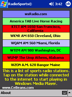 This program is a list of streaming sports radio stations. Tap on the station while connected to the internet to hear it with Windows Media Player.