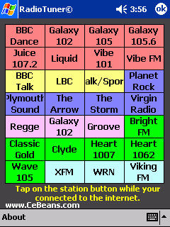 This program is a categorized list of UK radio stations. Tap on the station button while connected to the internet to hear the station with the Windows Media Player.