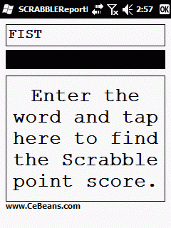 This program allows you to enter a word and when you tap the button calculates the scrabble points for each letter and displays the total scrabble score and allows you to export to bluetooth text file. Simply enter the word and tap the button to find the total points score for the word. The Scrabble points function is MIT License (MIT).