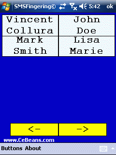 This program allows you to create pages of finger friendly SMS contact starter buttons. For each button you can add a contact name and phone number. Use the joypad left/right to change pages. Tap on the button to start the SMS composer to send a SMS to the contact.