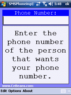 This program allows you to give your phone number to a person via SMS. Set your phone number (and notes) in the options dialog. When someone wants to know your phone number their phone number and tap the button to send it via SMS.
