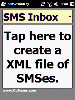 This program converts your SMS Inbox or OutBox folder into a XML file. Select the folder and tap the button to export the SMSes with the date/sender and text of each message as the XML fields. You can also preview the XML file in Pocket Internet Explorer.