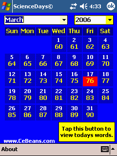 This program can be used to learn science terms and meanings. Each day of the year you have a few terms you can learn. The program has 783 terms/meanings.