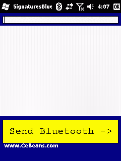 This program allows you to write you signature on a ink pad and when you tap the 'Send Bluetooth' button sends it via bluetooth to another Bluetooth enabled device. Enter the text of your name and use the stylus to write your signature. When you tap the 'Send Bluetooth' button the program will convert the signature into a 24 bit bitmap image and beam it to another bluetooth enabled device.