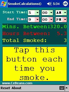 This program calculates the total number of smokes/min you smoke. Each time you smoke tap the button. The program will calculate the total interval for your smoking. Reduce the interval to quit smoking.